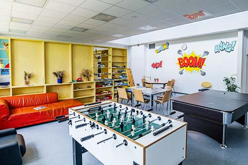 Im Flur- und Aktivitätsbereich können die Schülerinnen und Schüler ihre eigenen Fähig- und Fertigkeiten ausprobieren, z.B. Billard, Kicker, Spiele und vieles mehr.